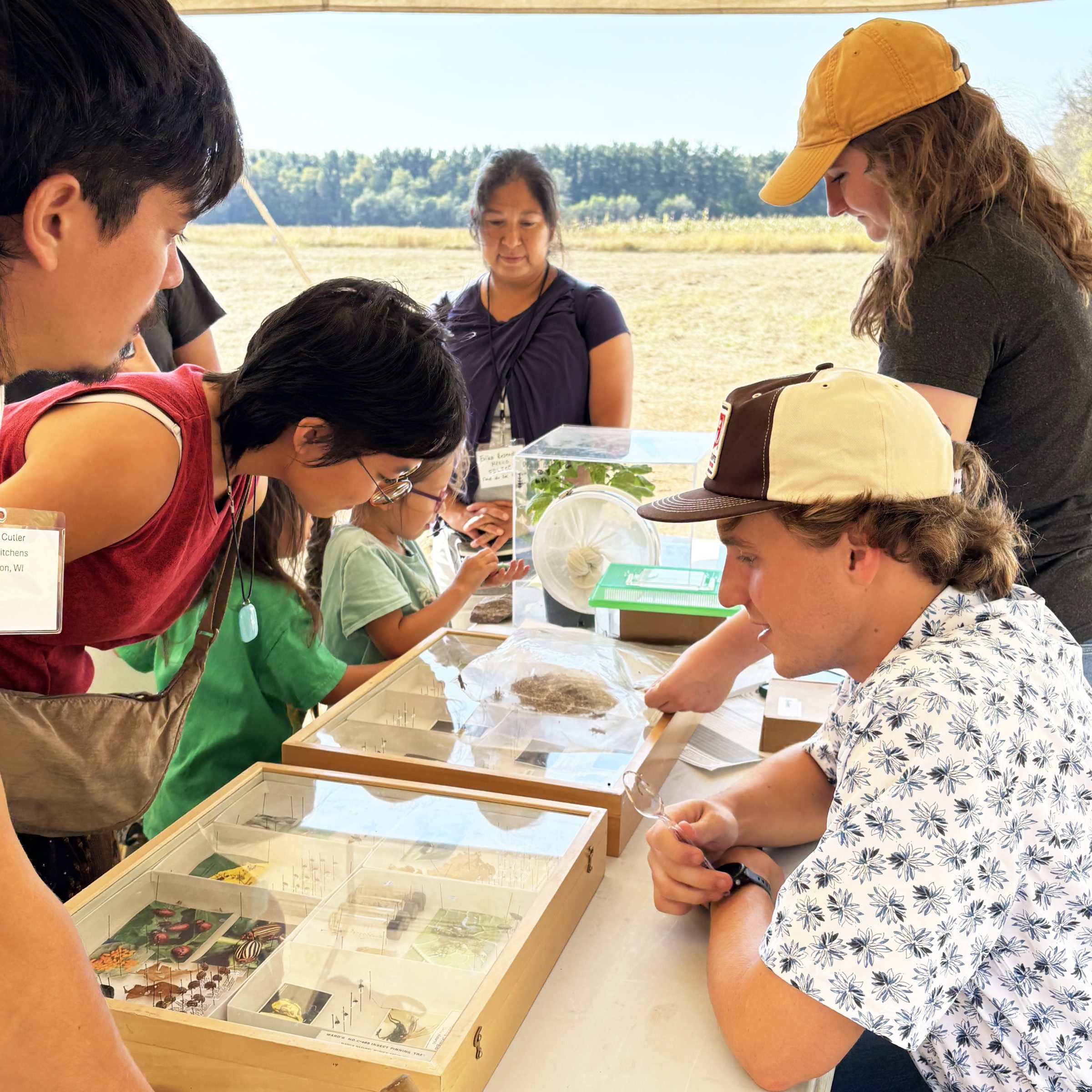 UW-Madison graduate student Paul Lema (Kichwa) gave a keynote address about his research collaboration with the Ho-Chunk Department of Agriculture and their shared understanding as Indigenous people who grow corn (see more photos from the College of Agriculture and Life Sciences here). Extension staff Rue Genger and Will Fulwider led a session on cover crops and soil health and demonstrated how to do soil tests. Biological Systems Engineering Professor John Shutske taught participants about agricultural equipment safety, focusing on small implements such as BCS walk behind tractors. Paul Lema and College of Agricultural & Life Sciences staff Dan Cornelius demonstrated different scales of equipment used for field cultivation, weed management, and harvesting corn. Extension staff Steph Garcia and Hanna McIntosh developed and shared a new resource about hand tools. Agroecology Program alum Dylan Bruce of Driftless Seed Supply led a workshop on vegetable seed saving. The Department of Entomology’s Insect Ambassadors taught participants about insects and brought cockroaches and caterpillars that were very popular with the kids.