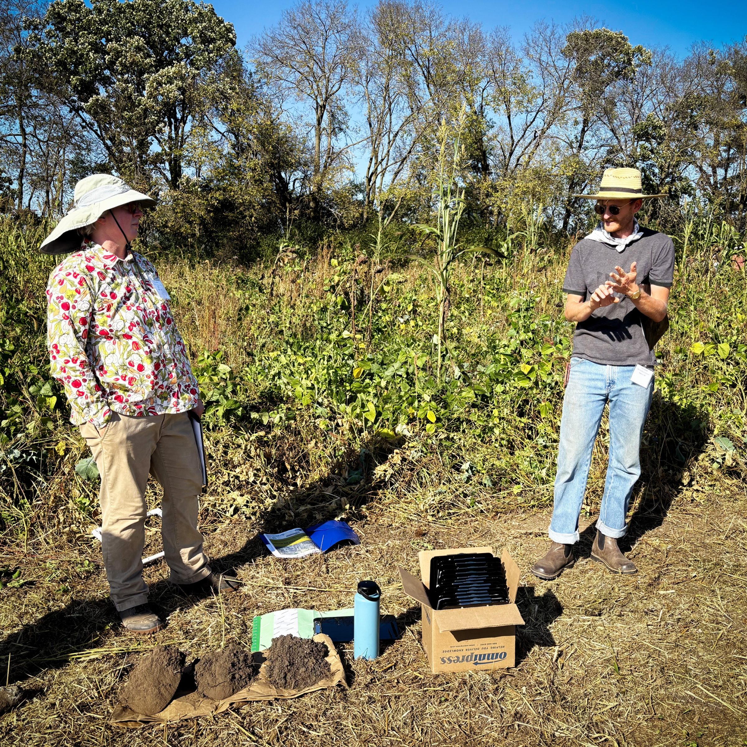 The event highlighted Indigenous food systems from the field to the outdoor kitchen to traditional crafts. Field sessions covered corn harvesting, corn braiding led by the Ohe·láku Cooperative, Indigenous seed saving and field walk led by Jessika Greendeer, cover crops, soil health, weed management practices, and equipment operation and safety. In the outdoor kitchen, participants learned hominy making from Vanessa Casillas, corn mortar making with Guy Reiter, clay pot cooking with Arlie Doxtator, making birchbark maple sugar cones with Wasanodae and Biskakone Johnson, and how to smoke meat with Elena Terry. In the Ho-Chunk House of Wellness gym, Kim Crowley led black ash basket making, Ashley Shawanda taught weed mat weaving, and Stephanie Muscavitch led clay pot making.
