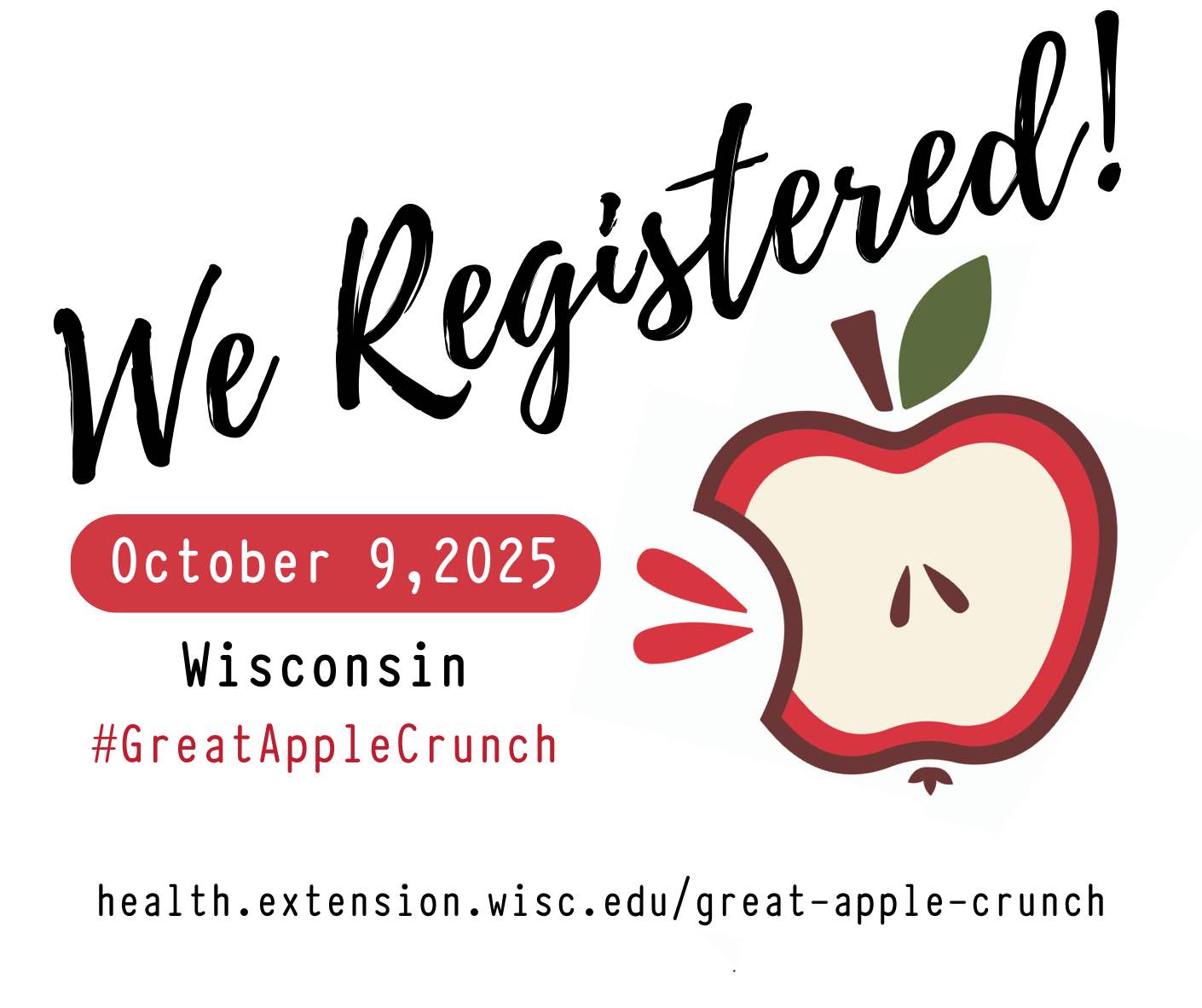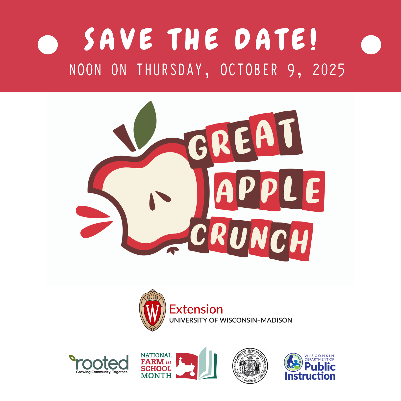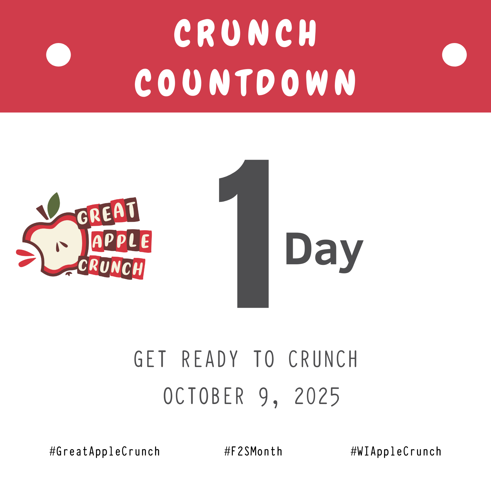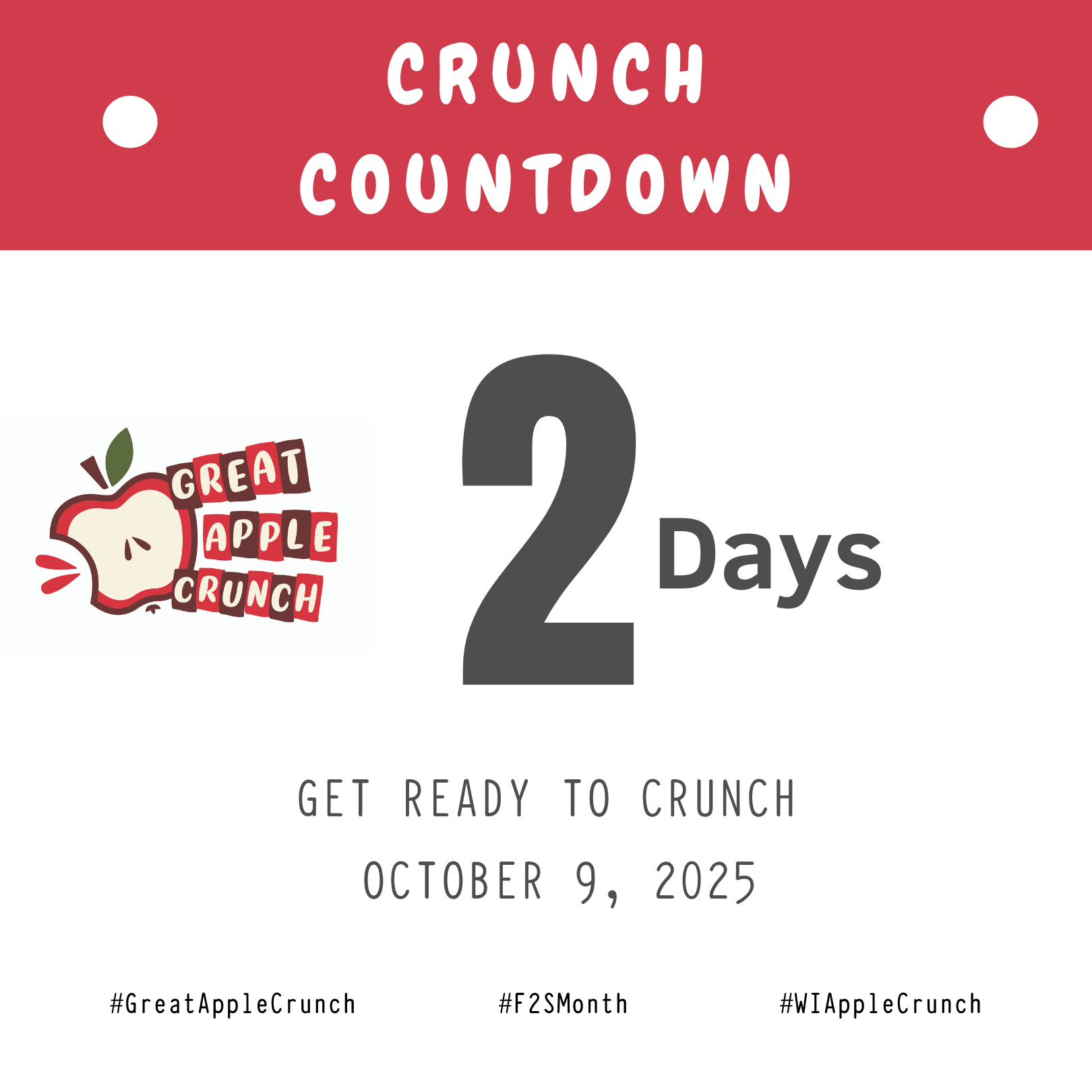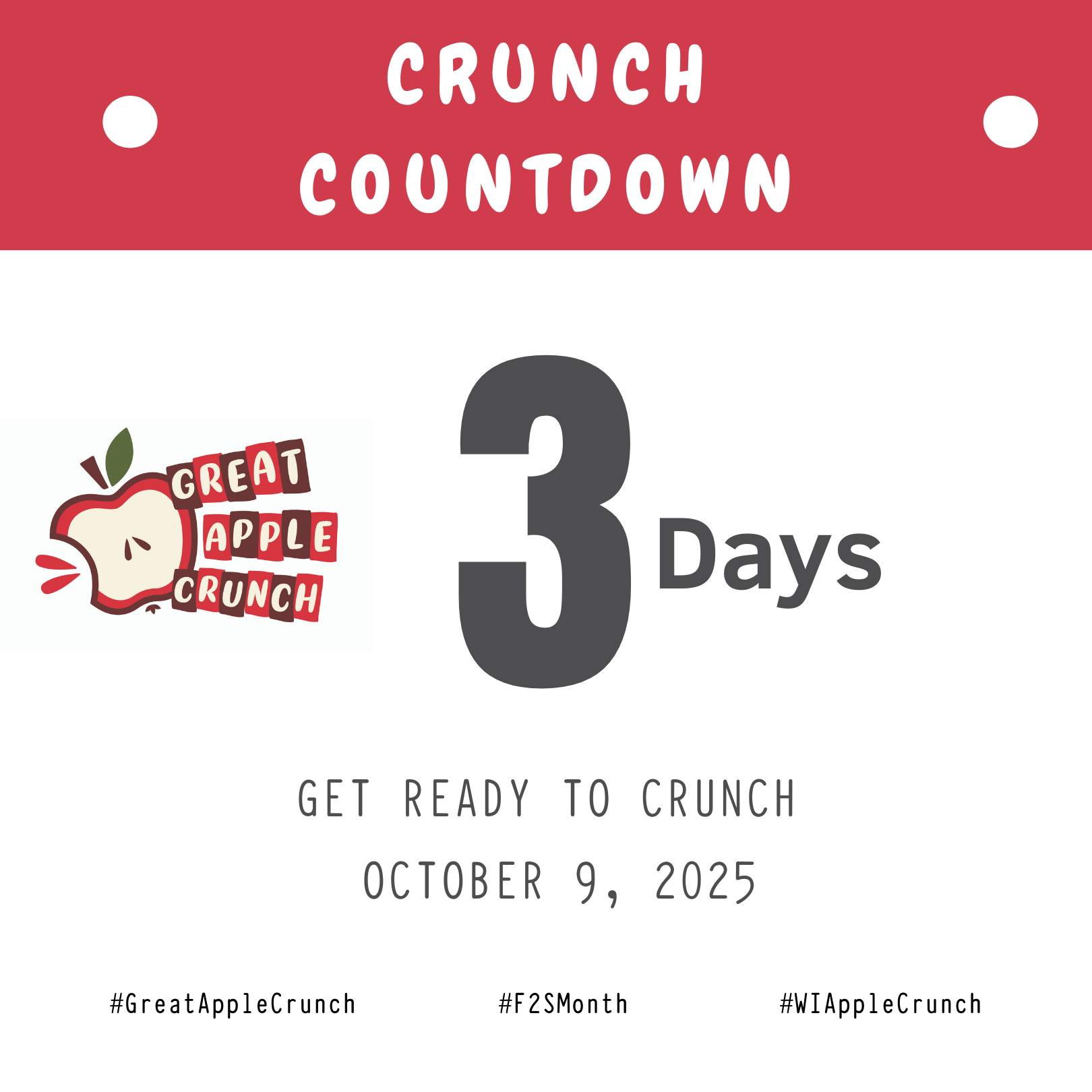 Grower Resources for The Great Apple Crunch Wisconsin Crunch Guide for Apple Growers Additional Resources Apple Crunch Supports Wisconsin Apple Producers Webinar Promotional Materials Crunch Benefits: Informational One-Pager “Farmers Support The Great Apple Crunch” Poster Crunch Day “Lunch Line” Flyer Crunch Logo Press Release Letter Template Facebook Posts Save the Date We Registered Count Down – 3 Days Count Down – 2 Days Count Down – 1 Day Crunch Day Post Success Stories Apple Blossom Orchard and Market Door Creek Orchard Eplegaarden Log Cabin Orchard Northwoods Orchard and Farm Market