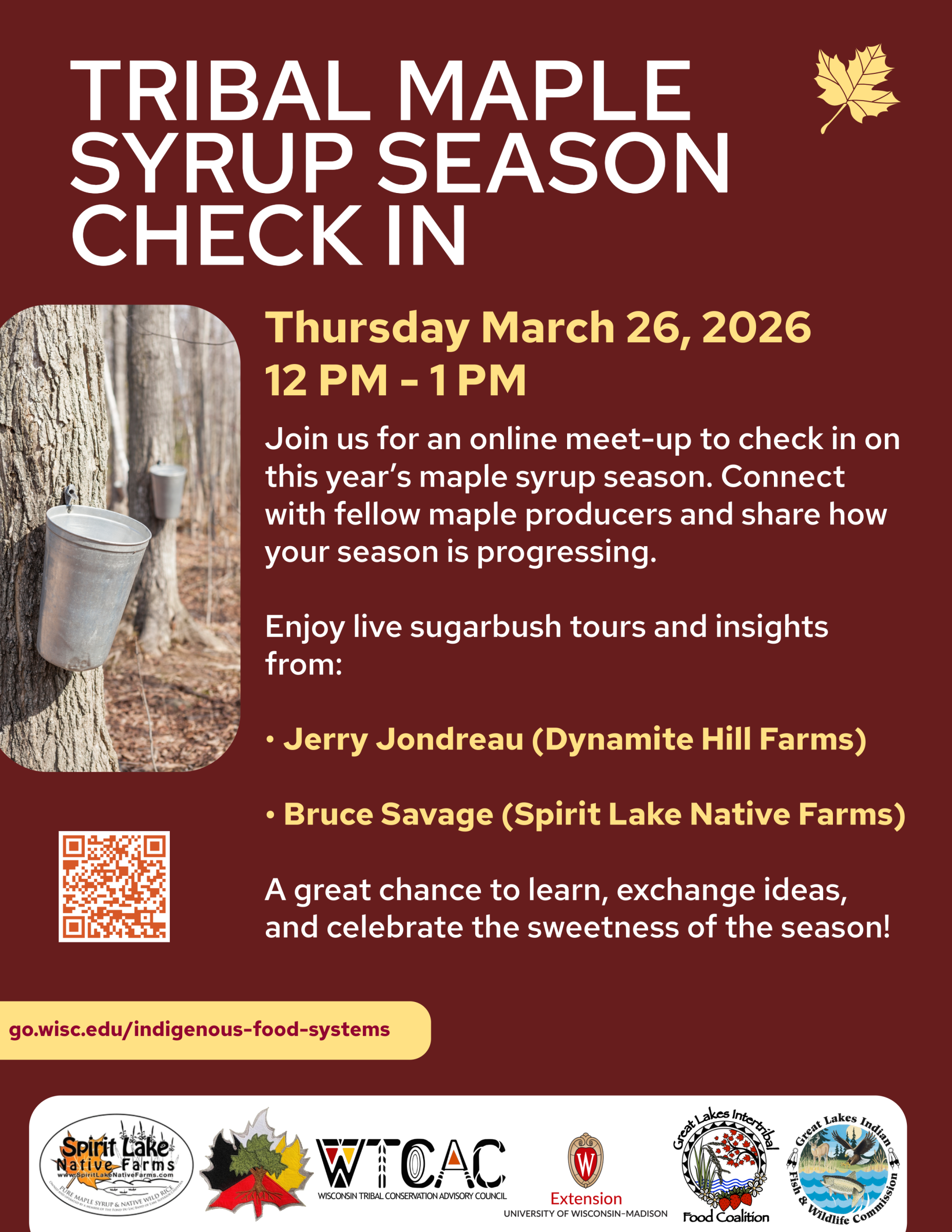Join the Wisconsin Tribal Maple Network us for an informal lunch hour discussion with Tribal maple producers to share and learn how the how maple syrup season has been progressing.